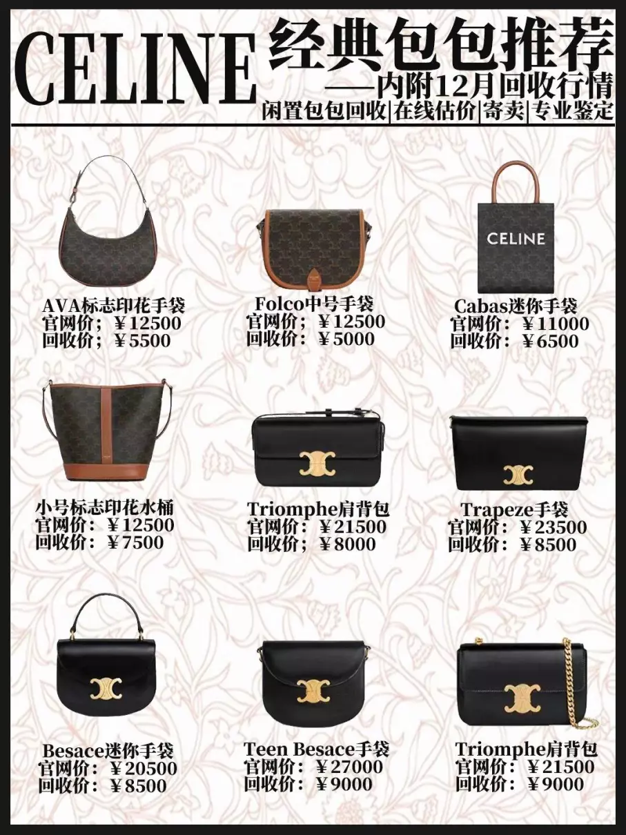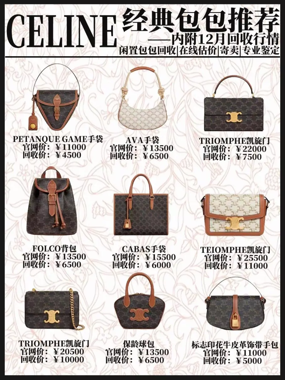 celine包包12月最新行情给大家整理好啦!快点来看看你心水的包包最近是什么行情吧~triomphe大家俗称的凯旋门,在二级市场的行情持续处于增长状态,可以说是当下celine最保值的包款啦ava / cabas自lisa带火之后,这两款包的热度也是居高不下,在二级市场中的行情也不错~classic