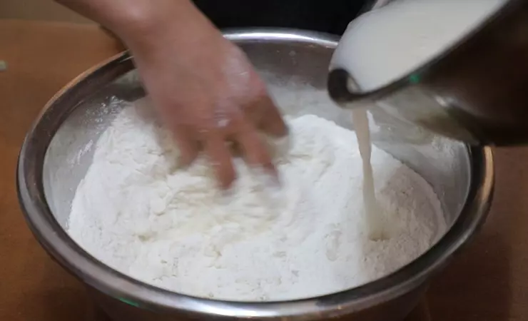 2、混合好之后慢慢的倒在面粉内,边倒边搅,这样把面和匀,家庭有泡打粉的可以再加几克泡打粉,加泡打粉发面会更快。把和好的面放在温水锅内加速面粉醒发,这个时间大概30分钟。