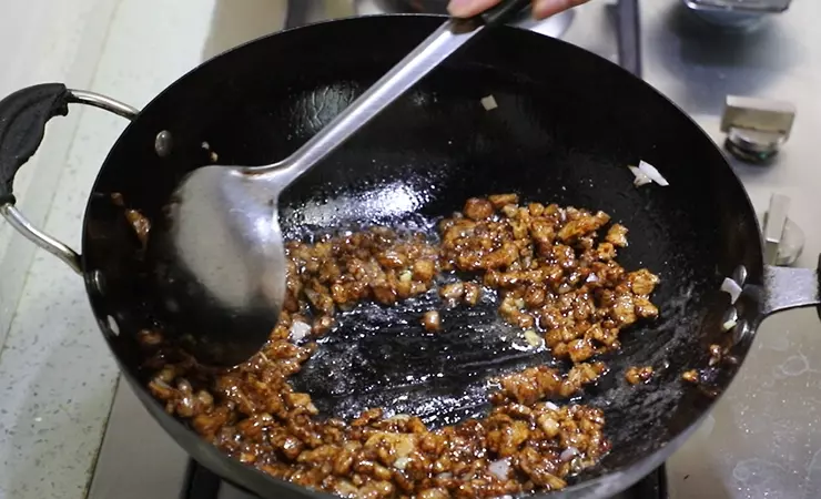 2、热锅凉油滑锅,下入肉丁炒香炒出油,然后加入葱姜炒出香味,再加入甜面酱30克炒香倒出备用,炒酱的时候记住不要炒糊了。