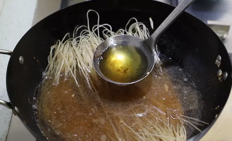 3、开始发粉条,不用洗锅直接加水800克,然后加入红薯粉条是250克,然后再加入植物油30克,加油是防止发好的粉条粘连,同时也起到增香的作用。