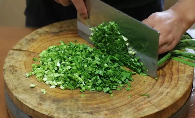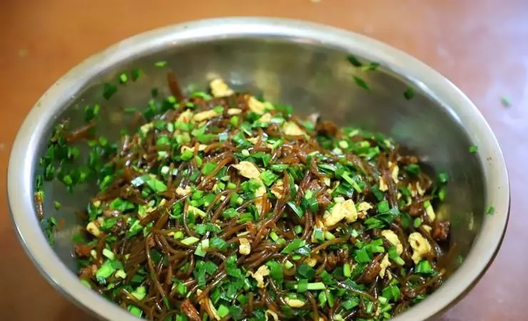 5、把粉条倒出用刀切碎备用,做包子也不要切的太碎了,另外我们还要准备炒熟的鸡蛋3个,韭菜末220克。