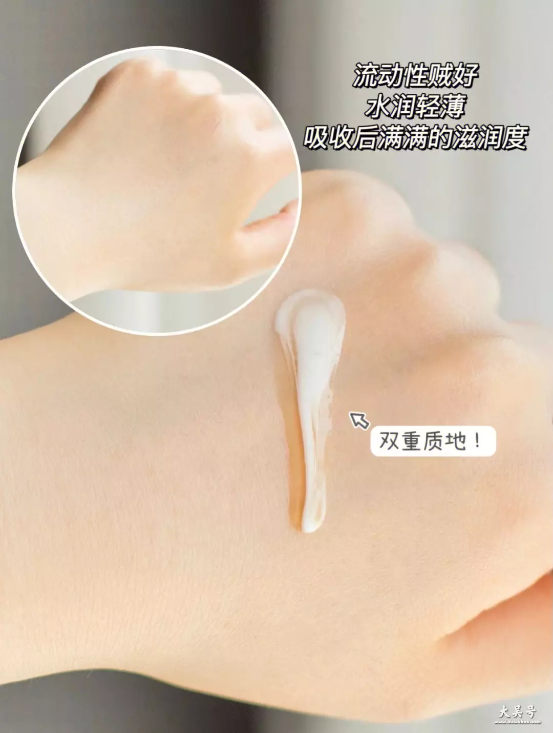 质地很顺滑,还带丢丢珠光感,推开后是细腻又柔滑的肤感,用起来润而清爽~每天用也不担心起脂肪粒的问题。