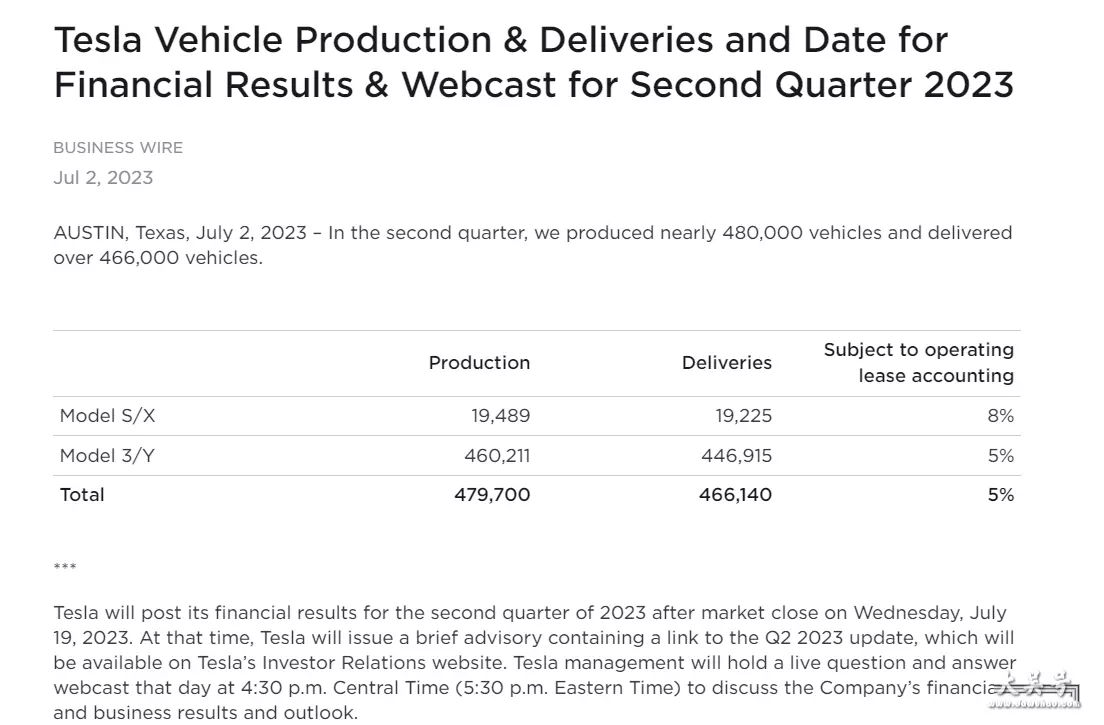 特斯拉7月2日发布的数据显示,该公司第二季度汽车产量47.97万辆,同比增长83%,预估45.66万;第二季度交付量46.61万,超过华尔街所有预期——预估均值为44.84万。