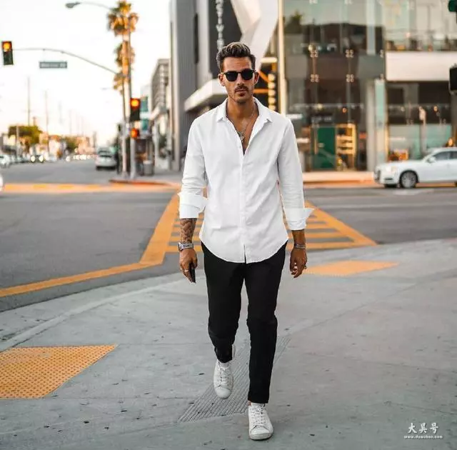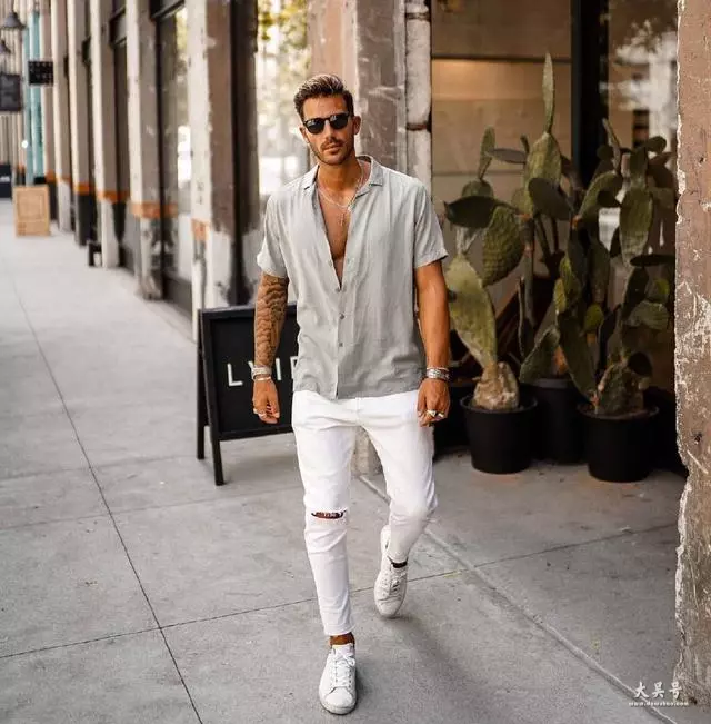 常常泡在健身房的男生们请不要浪费自己的好资本!穿修身款衬衫也能男人味十足的秘密来了,手动释放前几颗纽扣,大v领透露出的健硕胸肌真的很有野性美,古铜色肌肤和浅色衬衫的碰撞更有一种健康的美感。下搭的破洞白色长裤在整体色调搭配上很和谐,再搭配一双小白鞋更是好看又耐看。