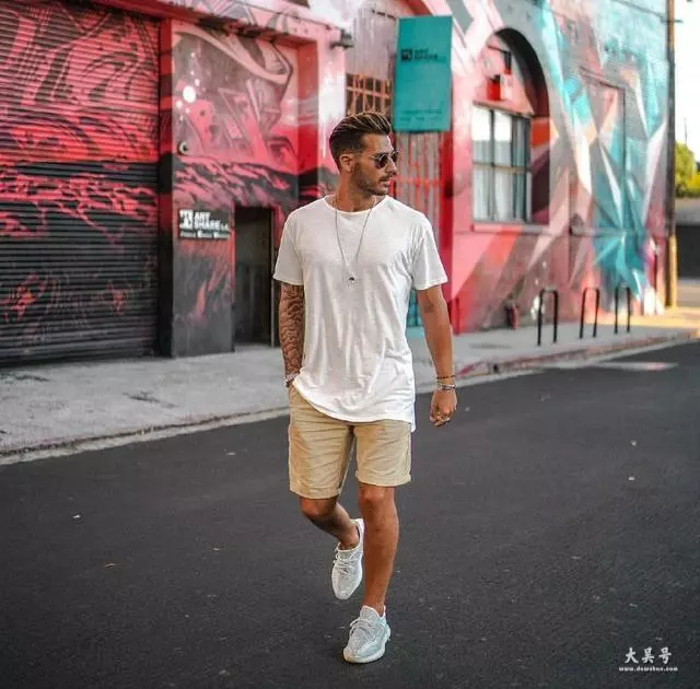 最简单的基础款往往都是经历了很多考验,才成为经久不衰的基础的。白色t恤+浅卡其色五分短裤,清爽干净的配色一看就很夏天。不愿意花太多心思在每日搭配上的男生,就可以pick这组基础款单品搭配。再搭配一双运动鞋,就是活力满满的大方造型。