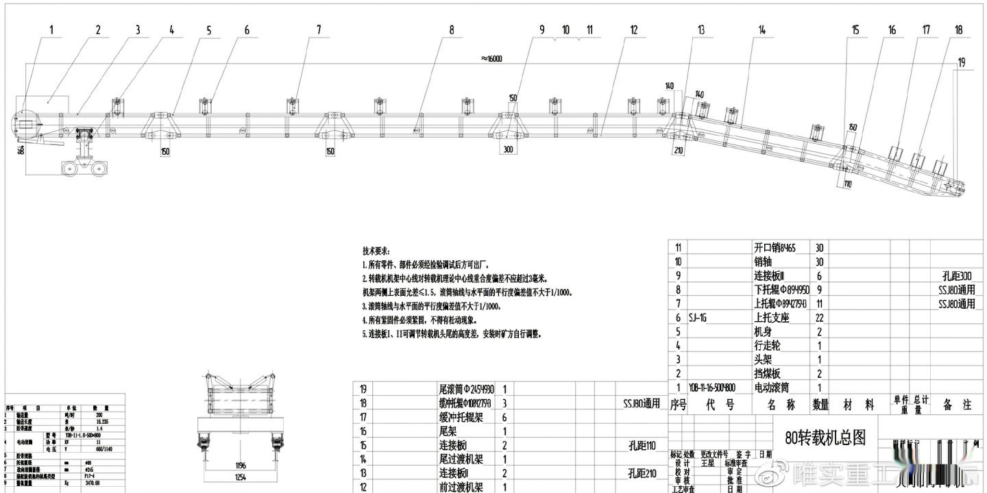 1.安装,先拆去悬臂式掘进机组合二运皮带转载机原转载部分,参照安装示意图将前架连接在掘进机机尾上。再往后架上安装行走架。前架、中间架、尾架用随机配带的销轴、开口销、连接板、将全机连接在一起。最后,挂上托辊组,辅设输送带钉好带扣,检查各部分安装情况,无误,将皮带涨紧,开空车试运转。