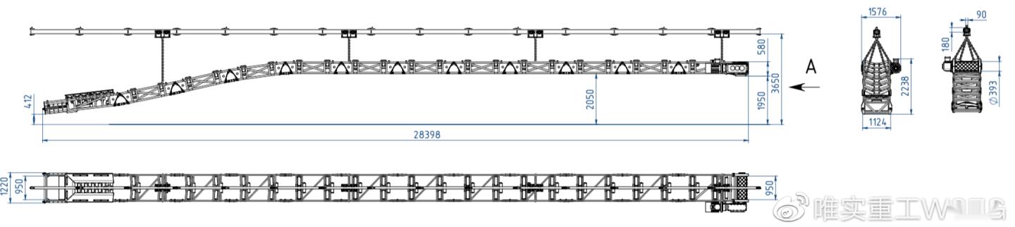 另一端,即卸料端则通过卸料小车骑在刚性架上。机头架与卸料小车间采用三维铰接方式实现支撑和连接。这样,当给料掘锚机前进或后退时,掘锚机牵挂二运皮带转载也随之在刚性架上前进或后退,三者组成一个输送长度可变的,具有物料破掘装运多功能的煤载连续转载输送系统。承担由掘锚机组到主皮带输送机间的煤载卸转载任务。掘锚机牵挂二运皮带转载前进到行程(25m)终端后,给料掘锚机后退,将二运皮带转载机推回到初始安装位置。此时成套装备长度最短。然后便可用适当的软连接件,如缆索或圆环连牢固连接给料破碎机和刚性架,由给料掘锚机将成套装备拖到新的工位,以便开始新的掘破锚装运作业。