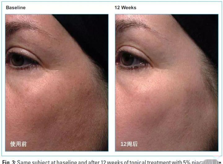 长期外用烟酰胺还可以减少皮肤的皱纹,据说原因有两种,一种是通过烟酰胺增加真皮层的胶原蛋白,另一种是烟酰胺可以使真皮层糖胺聚糖生产减少,正常的真皮结构和功能只需要低浓度的糖胺聚糖,浓度太高会使皮肤变差。