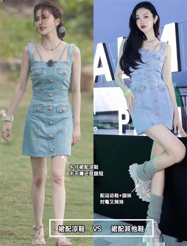 当一双本就容易产生廉价感的彩钻平底绑带凉鞋配上腰线位置偏低的牛仔连衣裙,就连样貌和身材为高配置的女明星都得“翻车”,普通人这样穿踩雷几率得有多高就可想而知了~