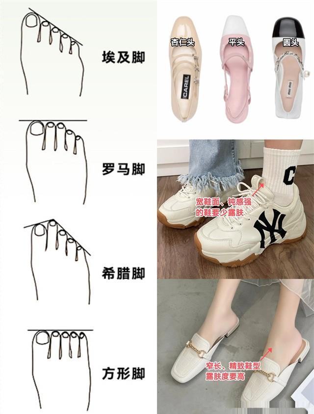 方形脚、罗马脚穿宽鞋头,埃及脚穿露趾、圆头等偏窄的鞋头,希腊脚穿尖头和圆头鞋的规则更是早就已经烂熟于心了。