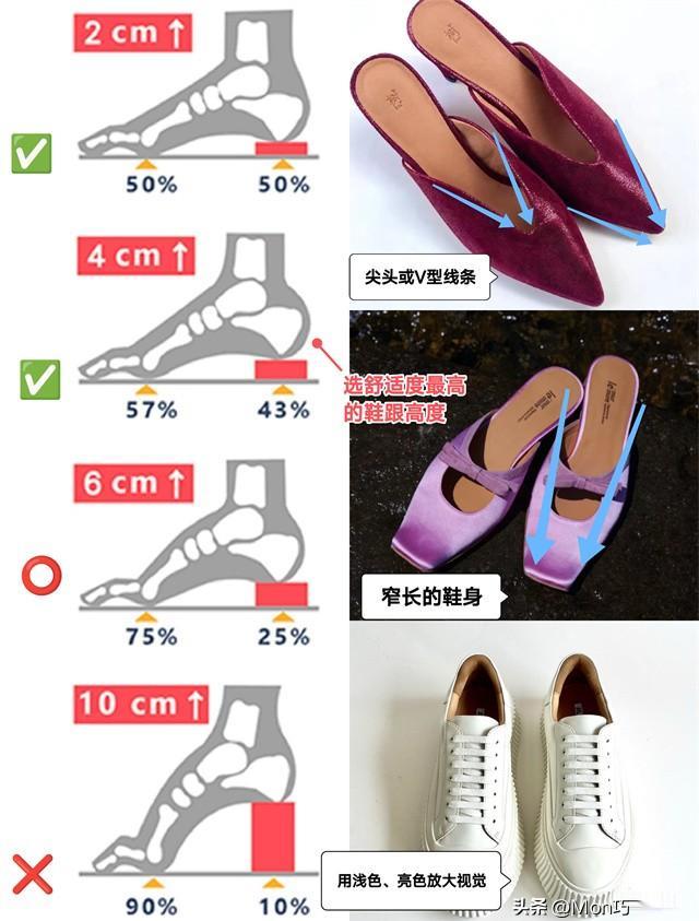 要让鞋子做到高跟鞋做不到的舒适,就要从跟高和视觉显高入手。通常2~6cm的鞋跟高度久穿也不累脚,非常适合上班族和穿鞋新手。