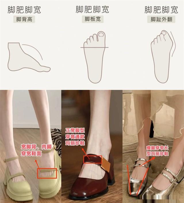 玛丽珍鞋要根据脚背宽窄和脚踝粗细去选款。高脚背要选带跟款;宽脚和肉脚就是大圆头、大方头的宽鞋面玛丽珍鞋;瘦脚穿有细绑带的小尖头、窄长型玛丽珍鞋更优雅俏皮。