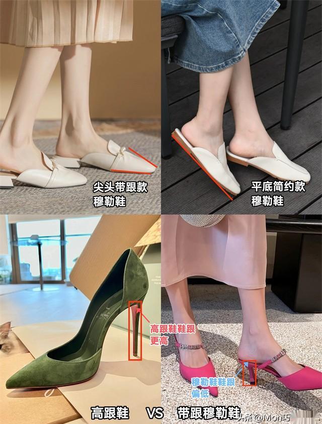 尖头穆勒鞋摩登,平底简约款穆勒鞋低调,带跟绑带款穆勒鞋娇俏可人,都值得一试。带跟款穆勒鞋和高跟鞋最明显的区别就是鞋跟高度:穆勒鞋通常为中低跟,1~3cm的酒杯跟、方跟和猫跟最为常见。
