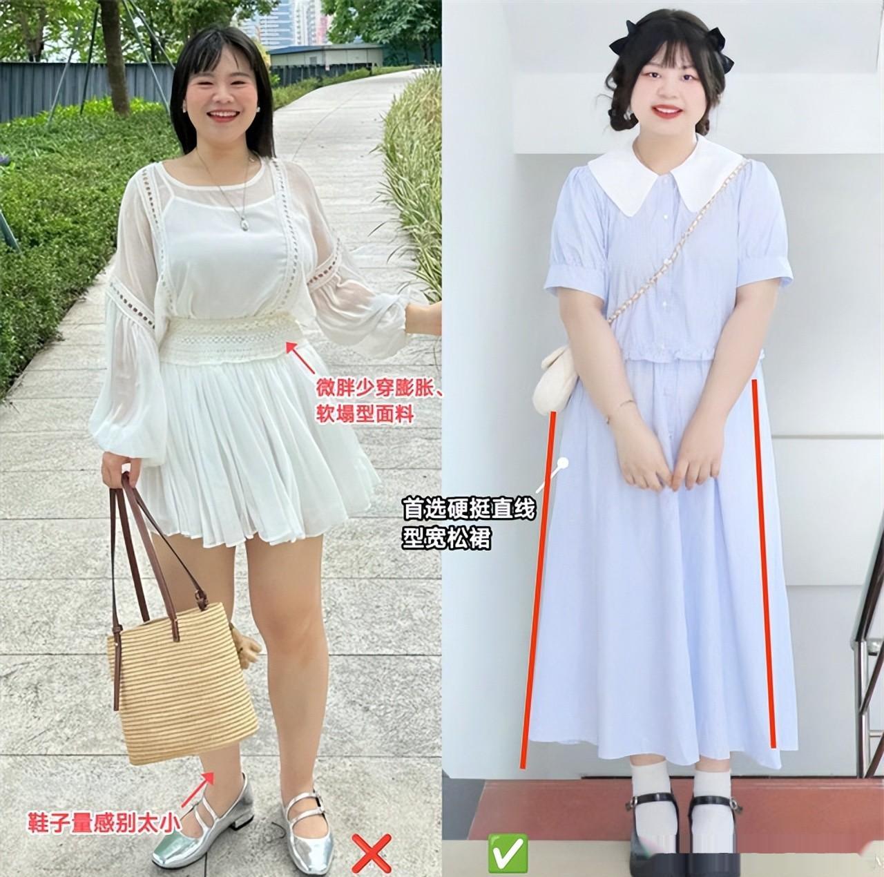 穿裙上也是如此。膨胀感强、面料软塌轻盈的裙装都会放大身材劣势。硬挺面料+直线版型+宽松裙摆才是胖女孩的正确打开~
