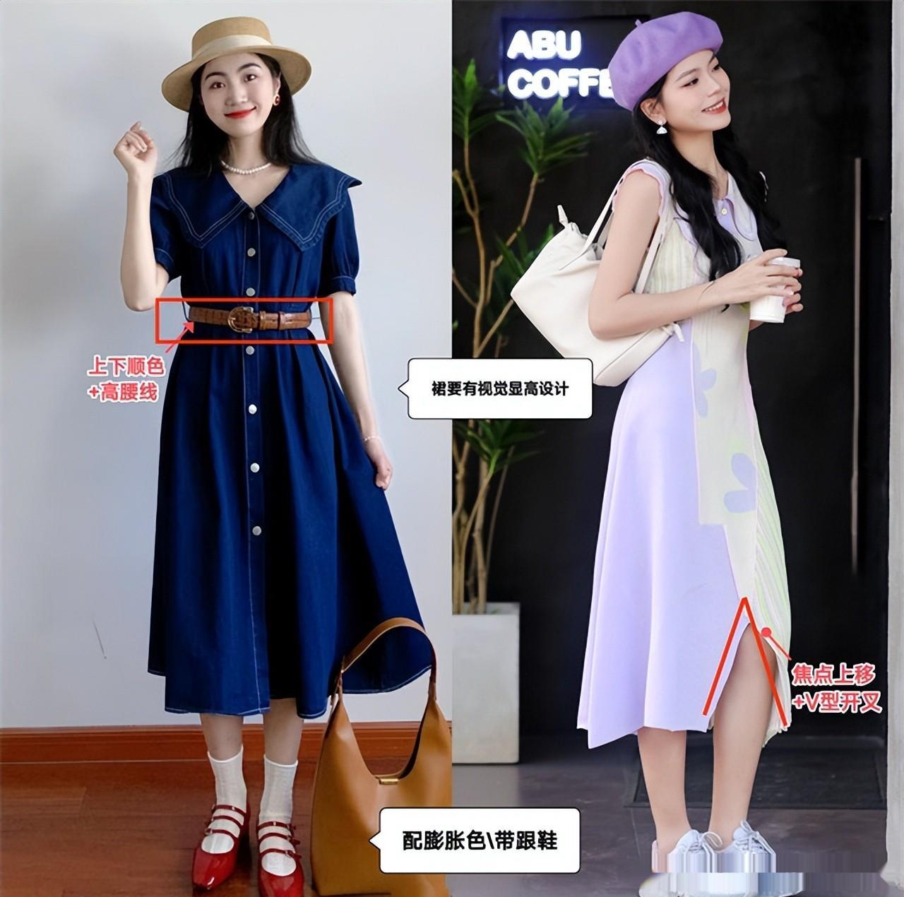 当然,上下顺色的连衣裙就加上腰带,用开叉剪裁、腋下包提高焦点,穿亮色、浅色鞋,都是属于小个子的“显高小心机”。