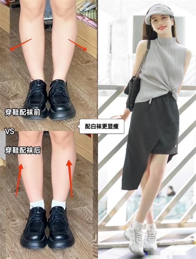 如果小腿粗、脚踝粗、脚还胖,那就别跟风单穿鞋、露脚部,配一双竖条纹织法的紧身白袜,再去穿穆勒鞋、运动鞋或玛丽珍鞋等会更显腿细。