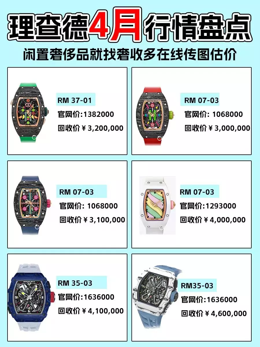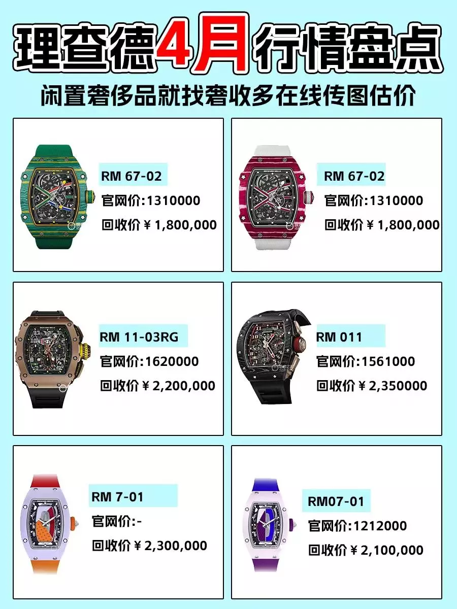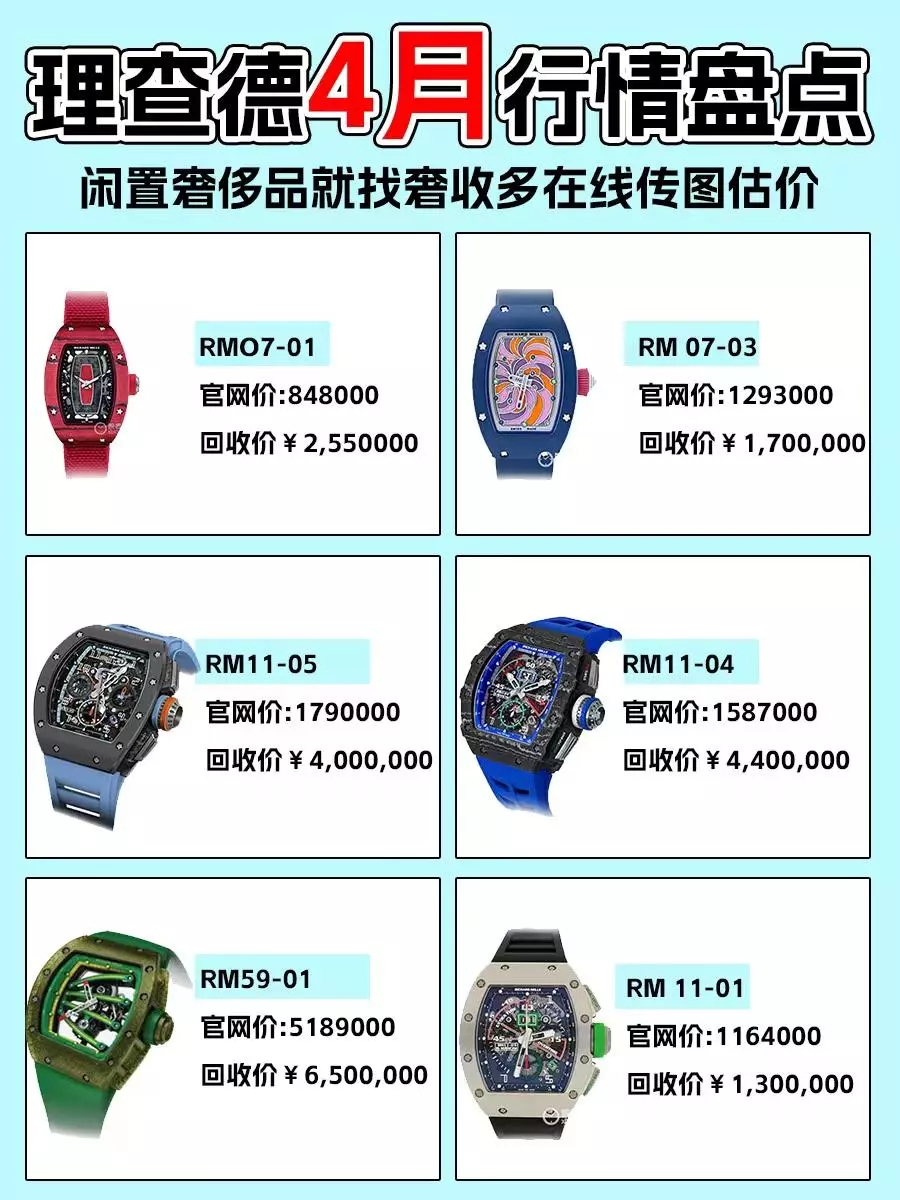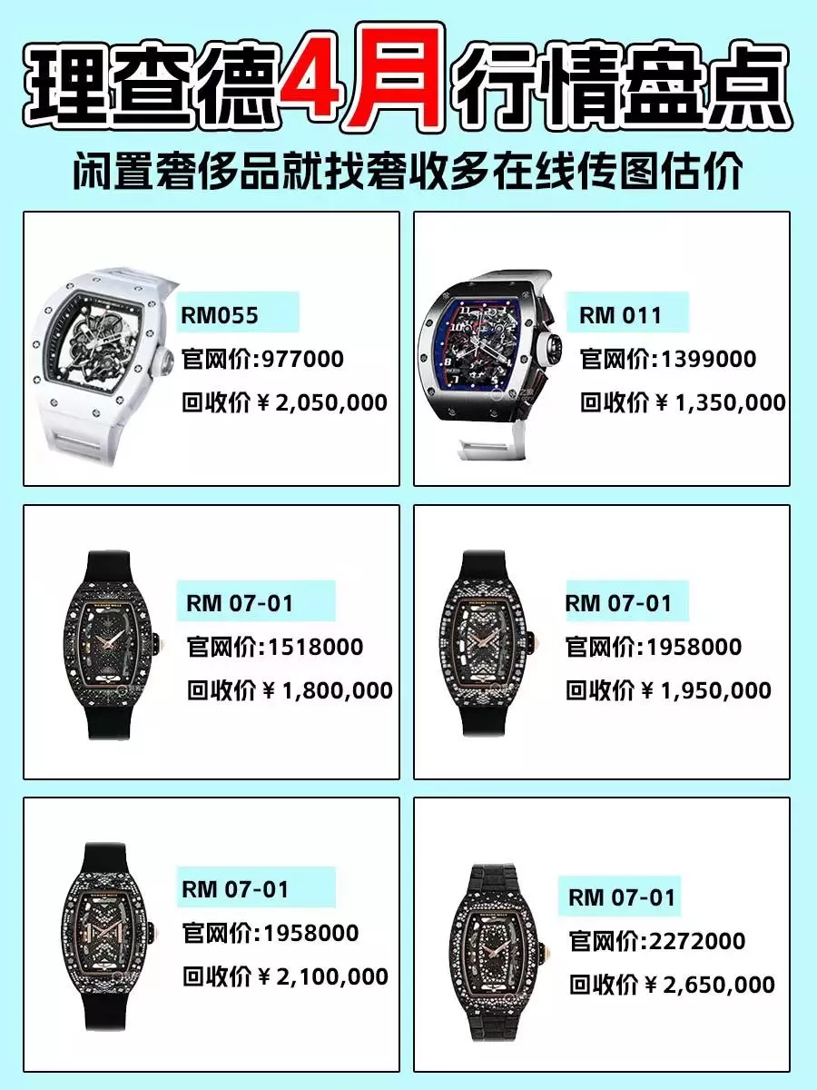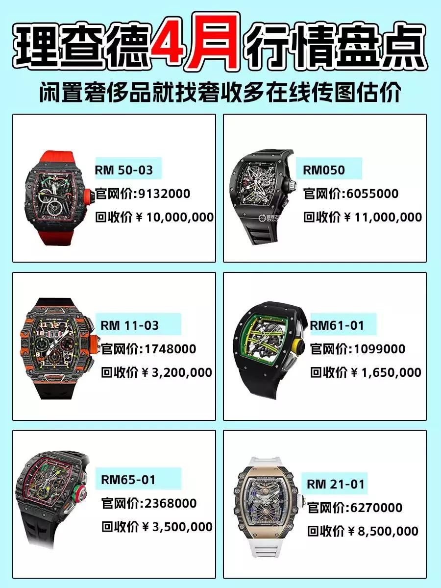 亿万富翁的入场券,理查德米勒。这个表即便对于不是手表爱好者的人也不会没听过吗,超级复杂的表盘加上高调外扬的外观设计往往令人印象深刻,当然,他最让人记忆尤深的还有他的贵,入门级腕表起步五、六十万,均价达到一百二十万左右,每年还有很多超过五百多万的腕表推出。所以,能消费起这个品牌的肯定不是普通人。那今天就带大家来盘点一下这款贵表的4月最新行情,赶紧看看你的表现在值多少钱吧!