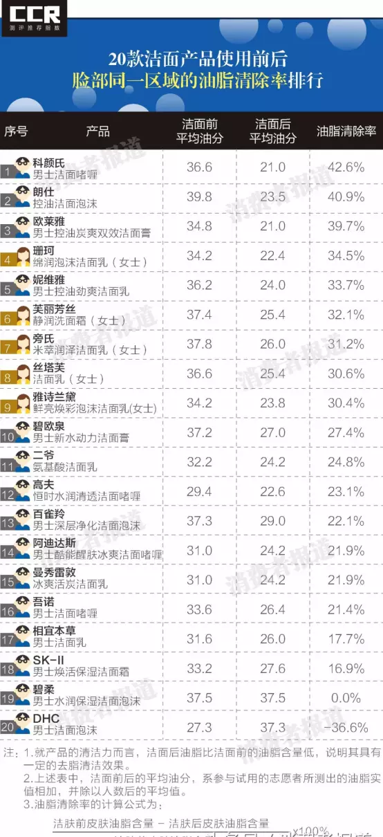结果显示,朗仕、科颜氏、欧莱雅、珊珂等产品的油脂清除率表现不错,在使用后,能有效降低了皮肤油脂含量,具备较强的去脂清洁效果。