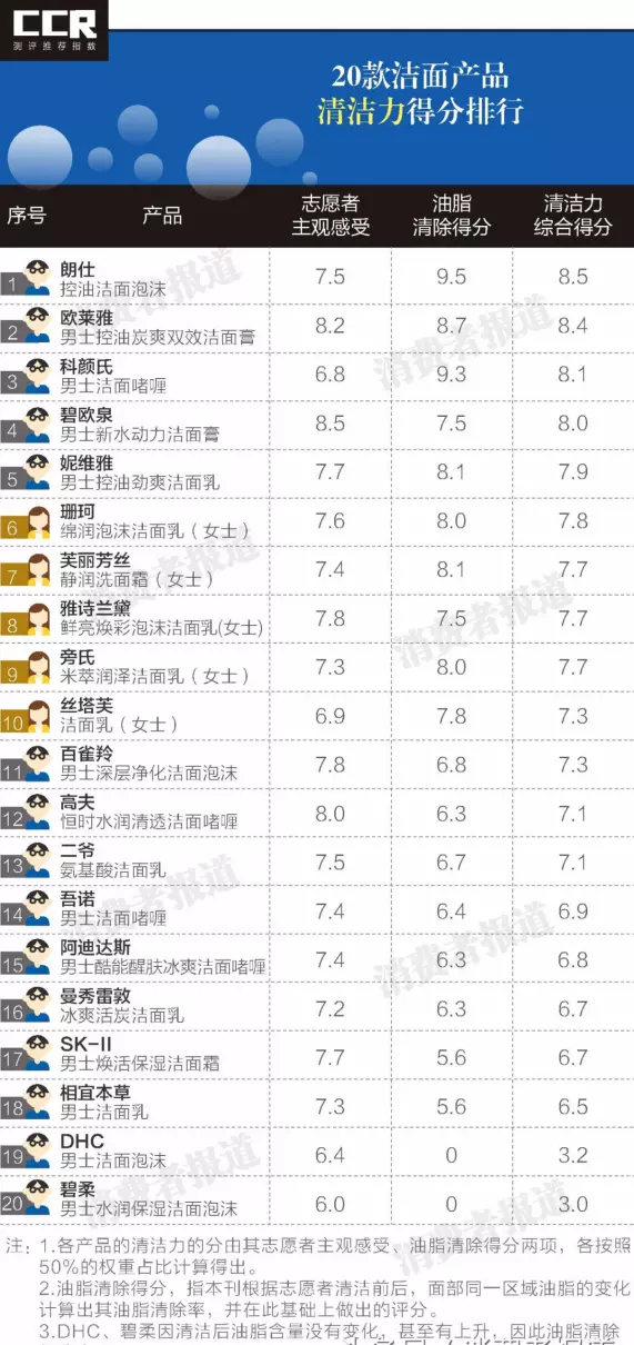 2. 清洁力方面,朗仕、欧莱雅、科颜氏表现佳,DHC、碧柔垫底。