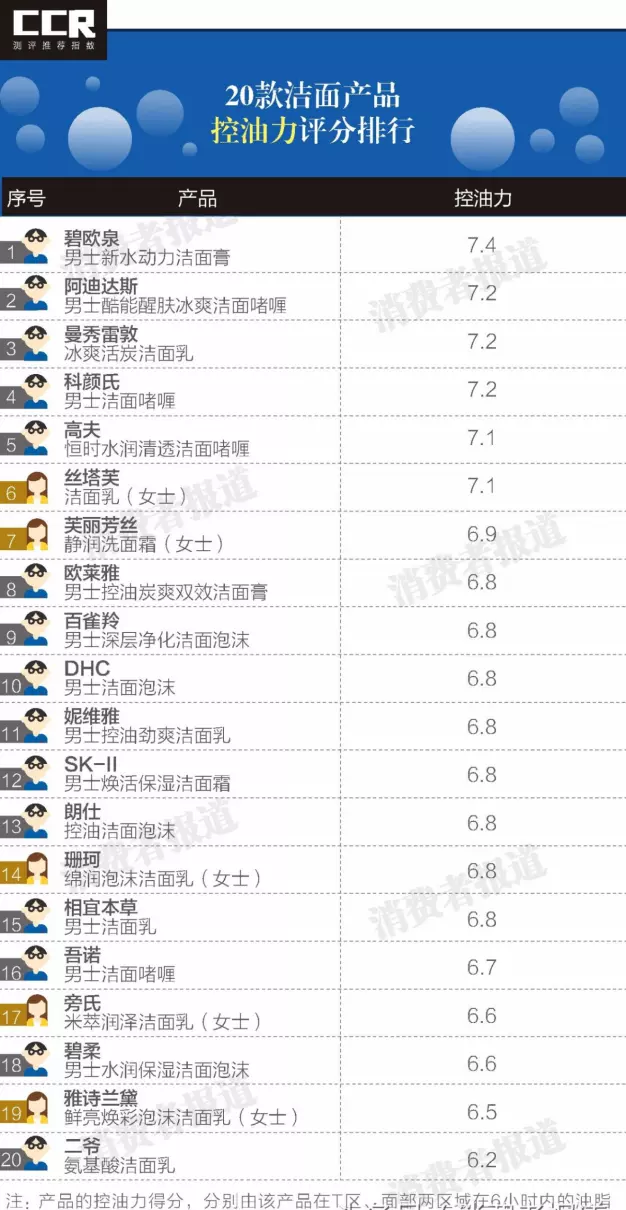 为了测试洁面产品的控油力,本刊邀请了3位志愿者,每人试用完全部20款洁面产品,并监测其洁面前、洁面后半小时、洁面后3小时、洁面后6小时,T区和脸颊两个部位油脂的含量变化,从而评价其控油力。