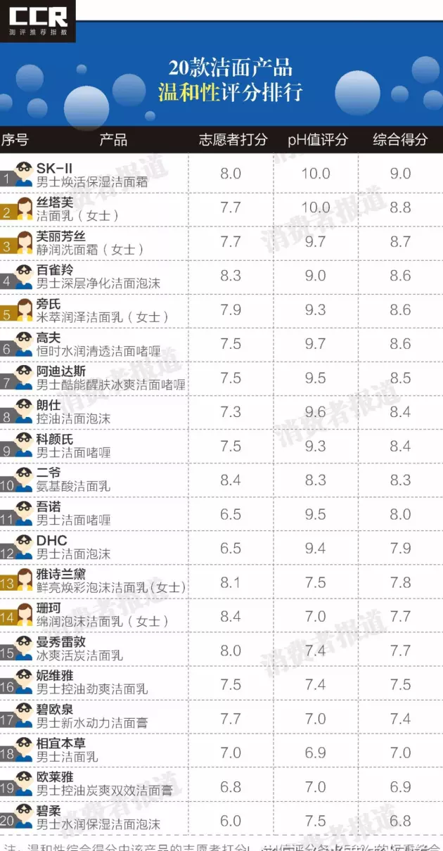 结合15位志愿者的主观感受评价,最终发现,SK-II最温和,丝塔芙、芙丽芳丝、旁氏等女士洁面产品也对肌肤比较友好,受到好评;碧柔、DHC、吾诺等表现较差。欧莱雅、碧柔、相宜本草等皂基产品相对比较刺激。