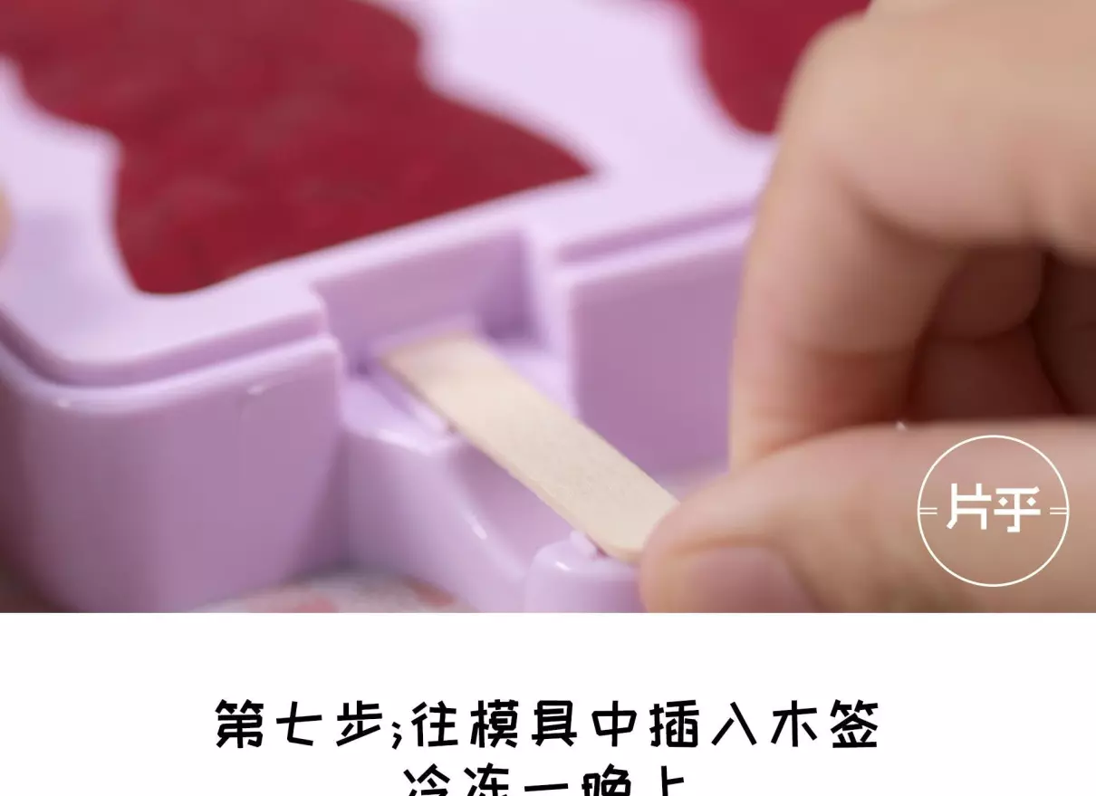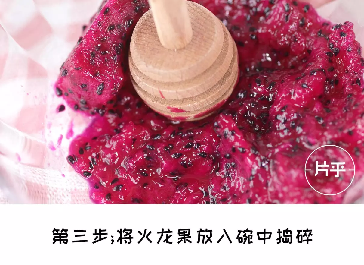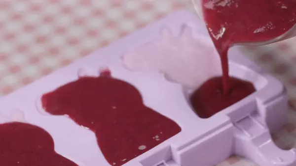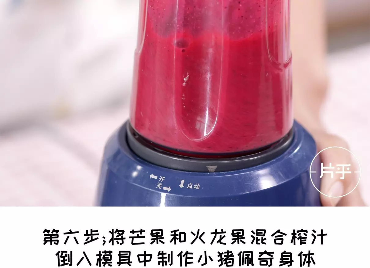 第六步:将芒果和火龙果混合榨汁倒入模具中制作小猪佩奇的身体。