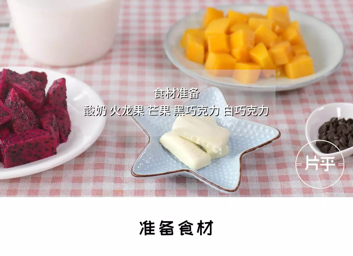 食材准备:酸奶、火龙果、芒果、黑巧克力、白巧克力。