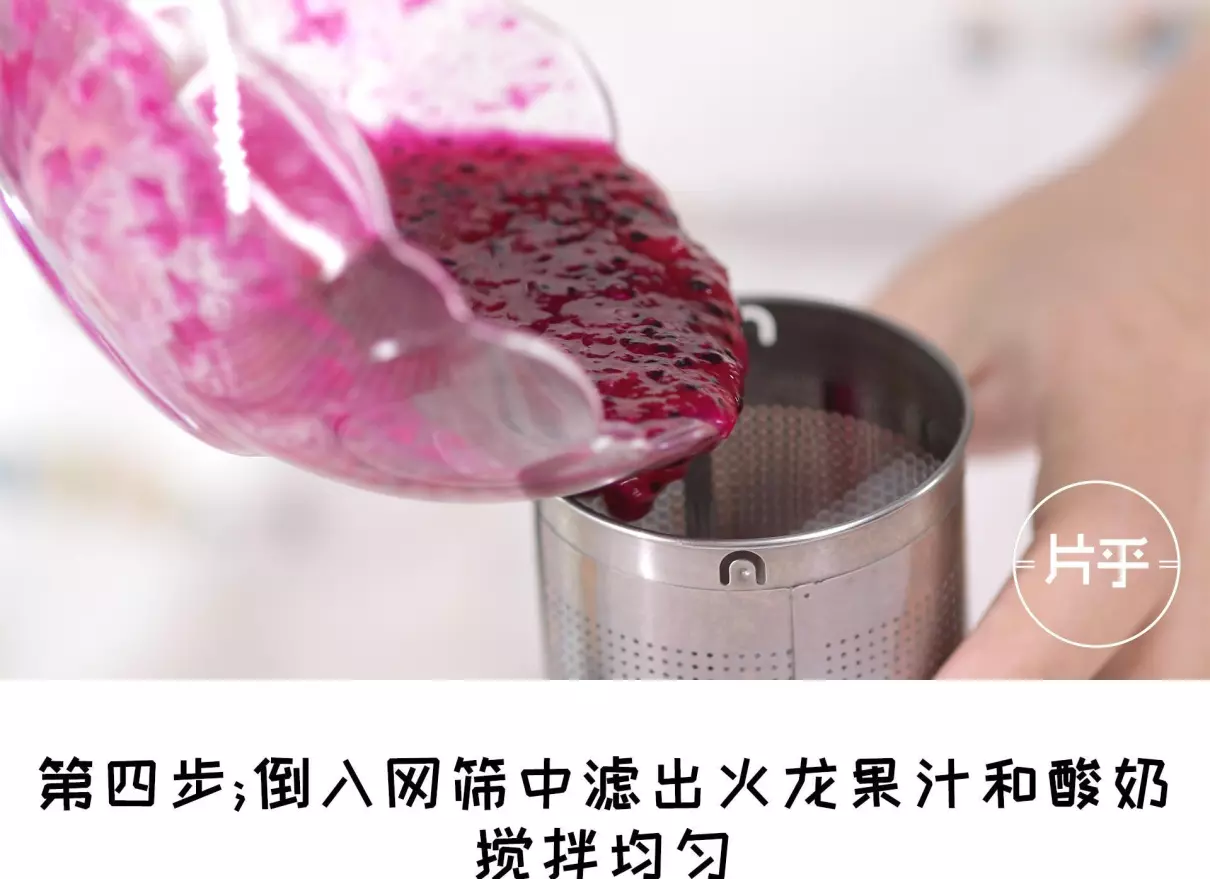 第四步:倒入网筛中滤出火龙果汁和酸奶搅拌均匀。