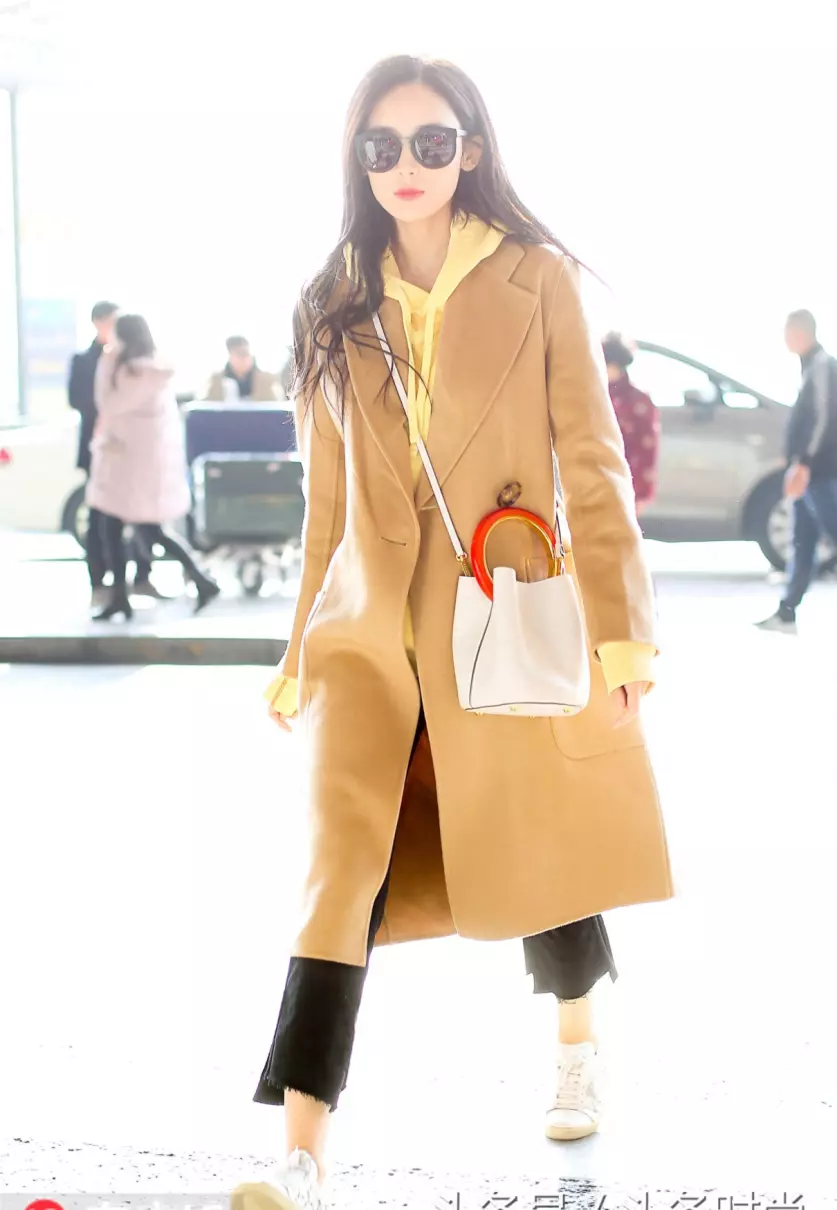 同样是古力娜扎,驼色大衣+鹅黄色连帽卫衣,Marni Pannier水桶包+小白鞋青春娇俏 。