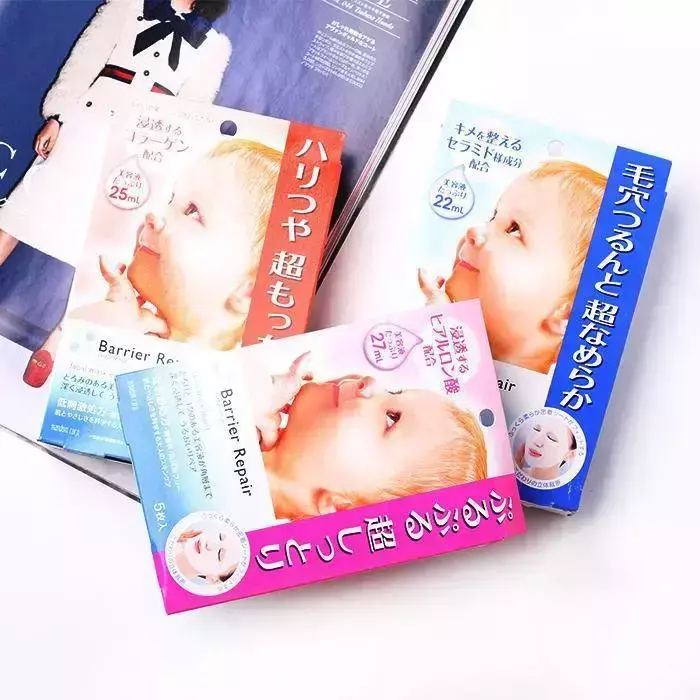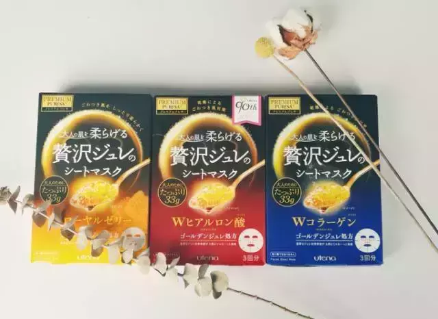 它分三个颜色分别有不同功效,粉色是玻尿酸超保湿型、桔色是超滋润胶原蛋白弹力补水、蓝色是玻尿酸保湿收缩毛孔型的