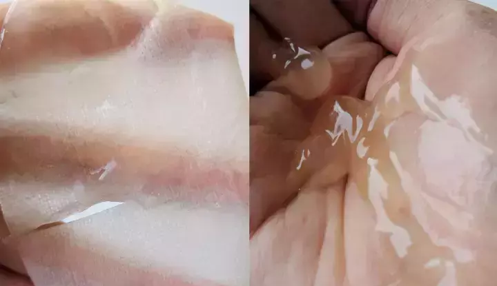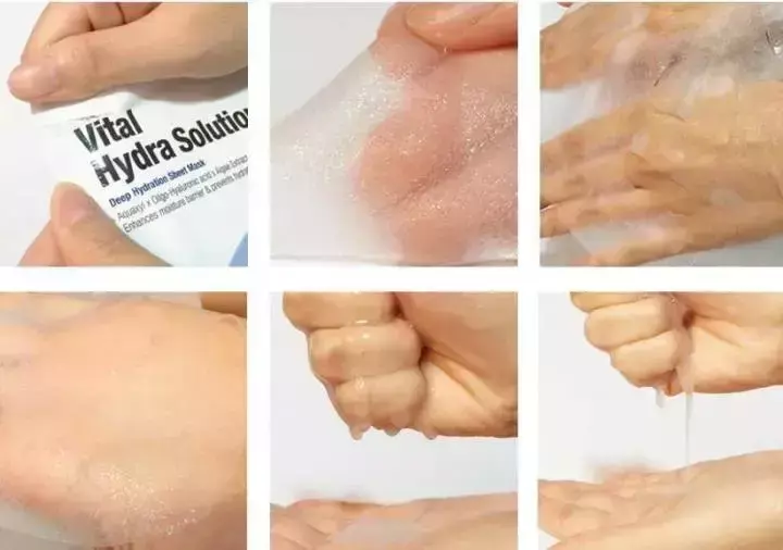 面膜布柔软密实,可以吸附住超足的啫喱状精华,面膜布已经满满的精华了,包装袋里居然还能倒出一手精华