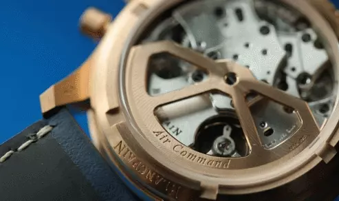 金质镂空摆陀和机芯颜色形成优雅对比,摆陀造型就像战斗机的座舱盖,也像航行方向盘,上面还镌刻有Air Command字样,寓意着冲上云霄的霸气、掌控人生的方向。