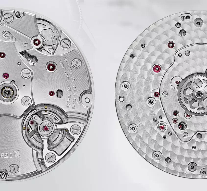 品牌辨识度极强的宝珀轮,与各种零件优美地组合在一起。机芯共采用8种高级打磨工艺,手工打磨的环形纹、拉丝纹、涡状太阳纹、鱼鳞纹等精美润饰尽收眼底,美学和技艺都是宝珀顶配级别。