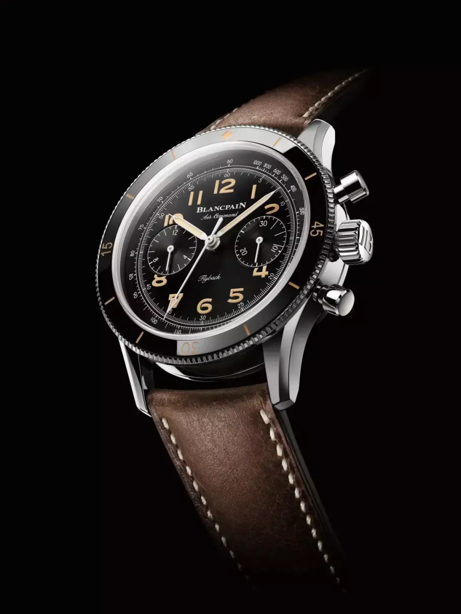 经典大气的盘面布局,沿袭了宝珀传奇表款——初代空军司令的传统基因,同时也融入了不少创新。两个对称副盘分别是30分钟计时盘和12小时计时盘,让整个表盘均衡耐看,6点位置的Flyback标识,代表着它比常见计时表具备更高阶的飞返功能。