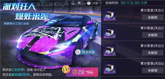 2021.11.26-12.09,阿斯顿马丁DB11全新涂装“派对狂人”开启2.5折超优惠折扣活动,除此之外,折上更有好礼相赠,获得新时装后即可参与全新活动“派对狂人,燃炸来袭”,累计登录解锁后续奖励!