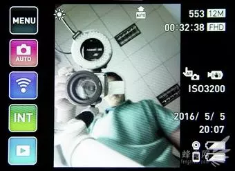 摄像机启动的主界面是这样滴,主界面左下角有一个回放按钮,按那个就会跳到回放界面,请见后面的回放部分。右上角有可拍摄张数和视频录制时间,剩下的是工作模式和时间,右下角可以同时显示摄像机和遥控器的电量,实测摄像机的电量消耗会更快一些。从上到下分别是MENU、拍摄模式、Wi-Fi、INT、回放。
