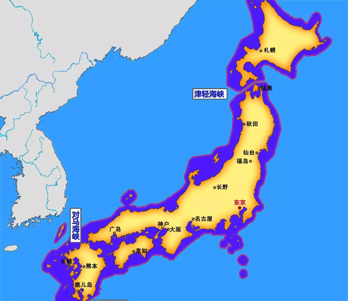 日本的整体形态是一道由东北向西南延伸达数千公里的狭长弧形,环绕在亚欧大陆的东岸,扼守中俄走向大洋的海上交通咽喉。其地利之便,直接体现在“四峡两岛”的地理格局。