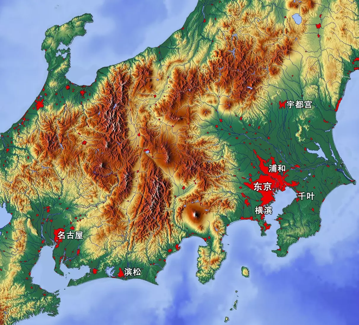 因山脉纵横,日本平原狭小,多分布在河流下游近海一带,大多是日本工业高度密集区。日本的太平洋带状工业地带自东京湾东侧一直延伸到名古屋、大阪和神户一线,以两成左右的国土面积占据着全国工业总产值的75%。关东平原上的东京都市圈是世界闻名的城市群,以东京为中心的“一都三县”(东京都、埼玉县、神奈川县和千叶县)拥有全国人口的1/3,如此高度城市化的地区,抵御轰炸的能力是十分脆弱的,亦不利于战时生存和保障持久作战。