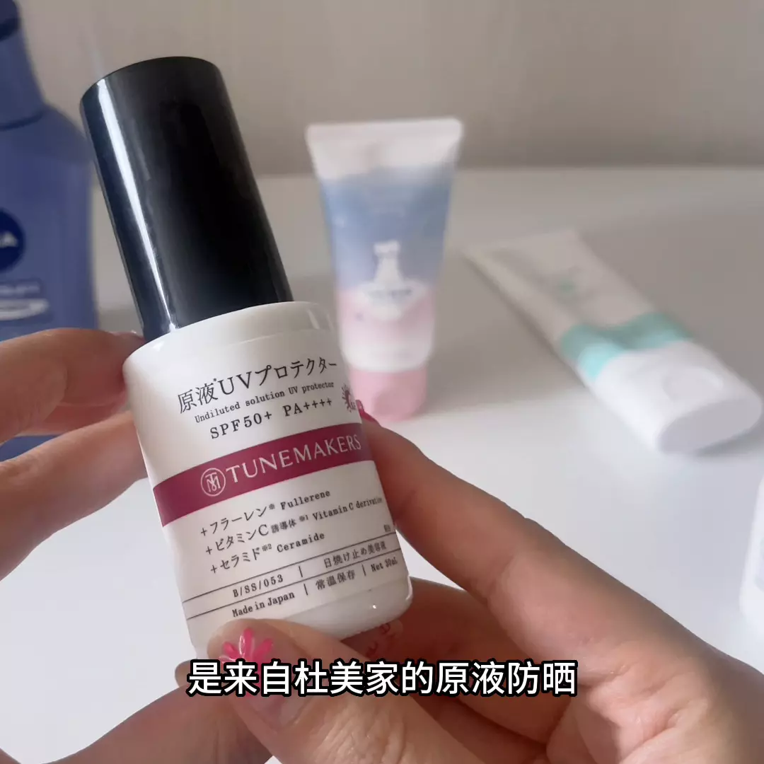 第二款脸部用的是来自杜美家的原液防晒。主要成分:高浓度富勒烯神经酰胺。防晒的同时还能美白。用前记得摇一摇。这款的质地就是这种偏乳液的质地,很容易推开也很好吸收,不会搓泥,所以和后续的底妆也不会打架。