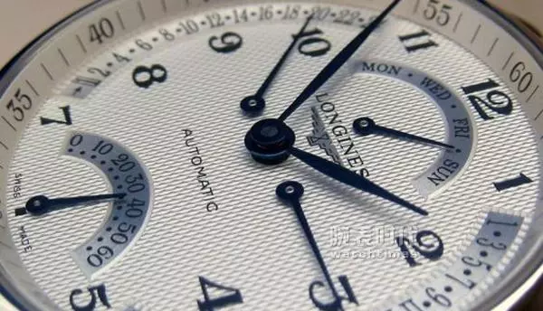 从外观上看,逆跳表最明显的特征就是盘面上的扇形显示区域,如上图表款逆跳星期是将周一“M”至周日“S”以扇形的展开角度分布开。除此之外还有日历、月历、时、分、秒和月相(这个比较少见)逆跳,更有甚者在一个机芯中设计多种逆跳或是秒针的双逆跳,例如宇舶Big Bang Unico 双逆跳计时腕表。