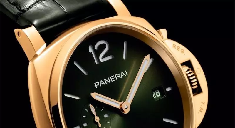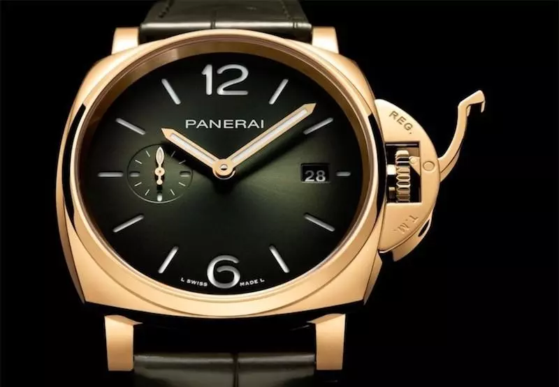 全新Luminor Due庐米诺杜尔系列腕表(PAM01423)是第一次把黄金材质应用到该系列中,绿色表盘由中心向边缘色彩逐渐加深,3点钟位置设有日期显示,9点钟位置设小秒盘,时标涂覆白色Super-LumiNova?夜光涂层,在黑暗中泛起绿色夜光,搭配绿色鳄鱼皮表带,表带针扣同样是黄金材质,整体金绿搭配,显得优雅贵气。机芯方面还是P.900自动上链机械机芯,3日动力储存,50米防水。