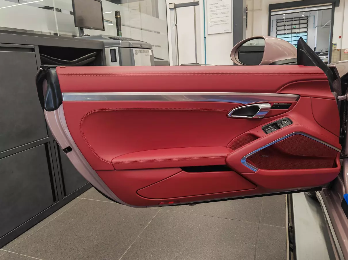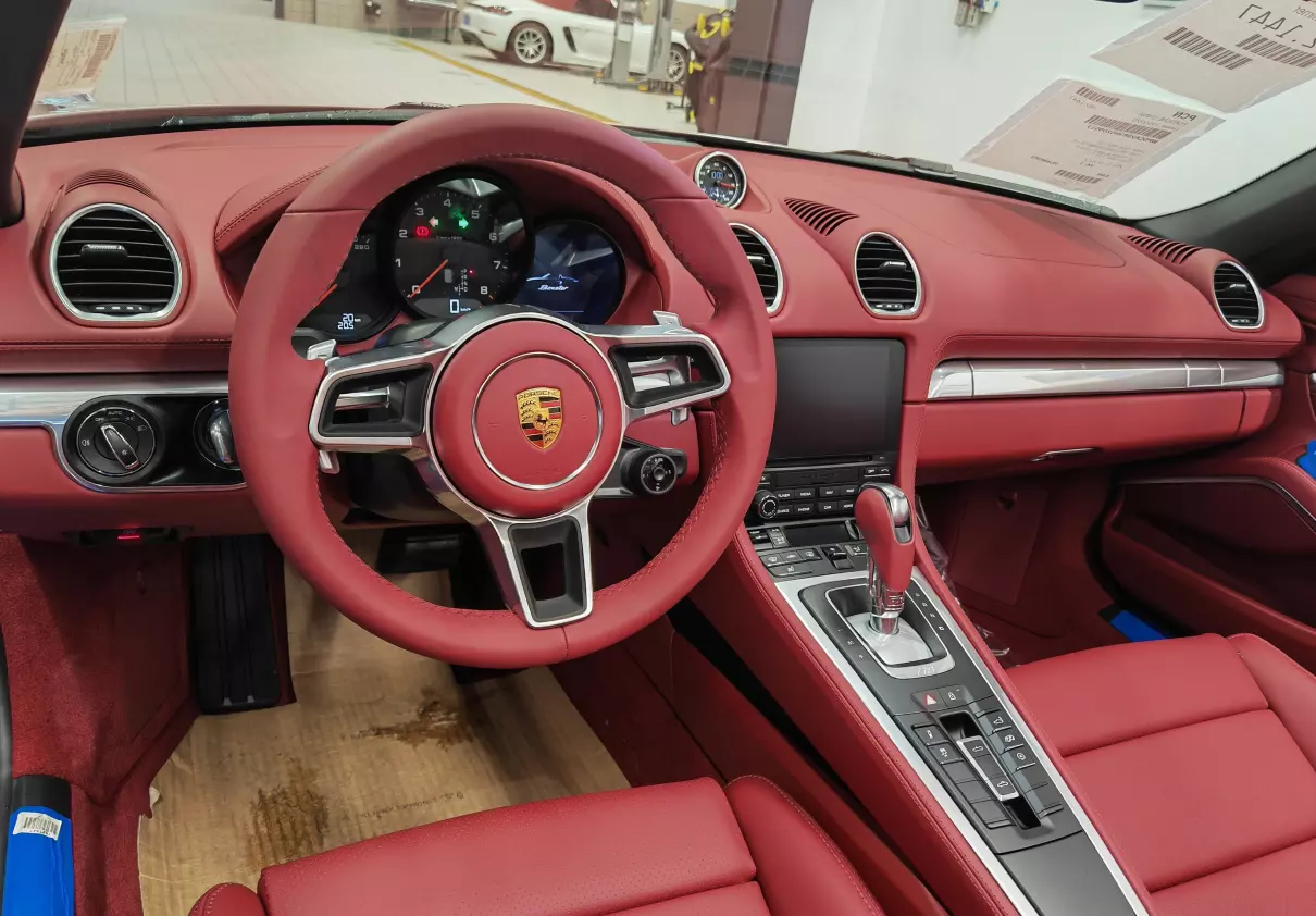 车内选装特殊颜色波尔多红真皮内饰,非常的艳丽,这种小跑车选这种配色最合适不过了。车内功能区布局非常的对称,且中控区域保留了大量实体按键,这跟现款911风格就不一样了,跟991时代的911倒比较类似。仪表盘是机械+液晶的组合,正中是转速表以及挡位显示,左侧是时速表,表底280km/h,实际极速为260km/h。右侧液晶屏可以投射多种信息,包括多媒体、车辆信息、导航地图(如有选装)、胎压等。