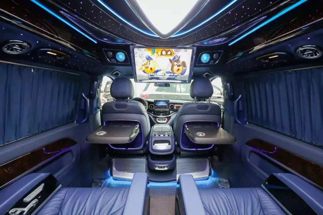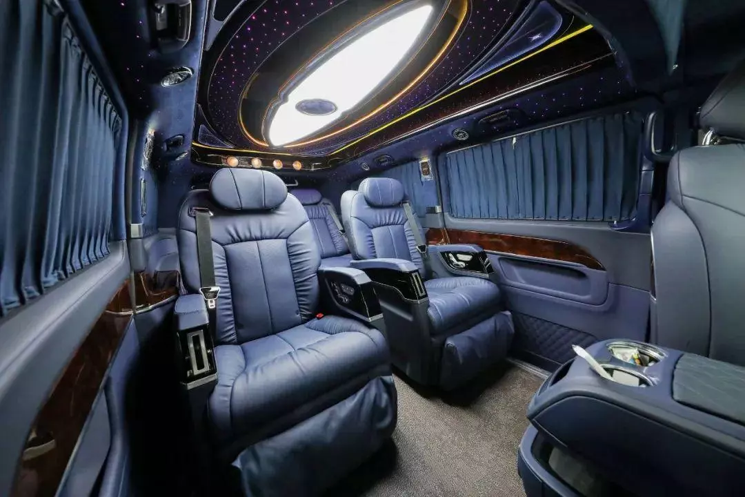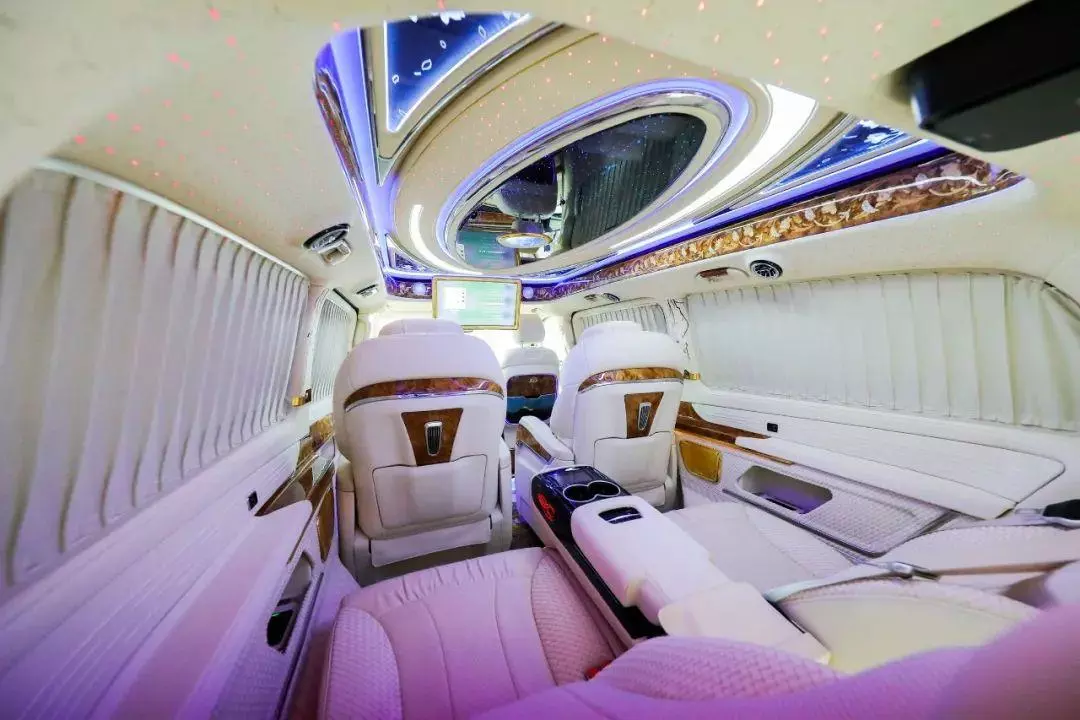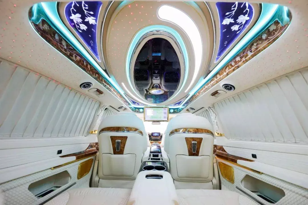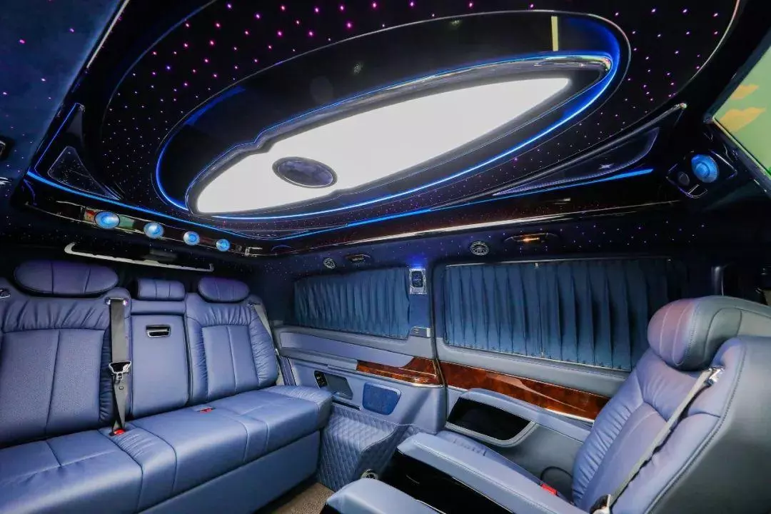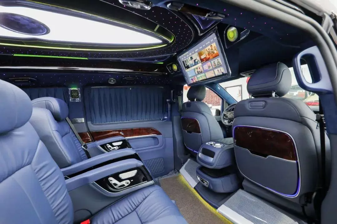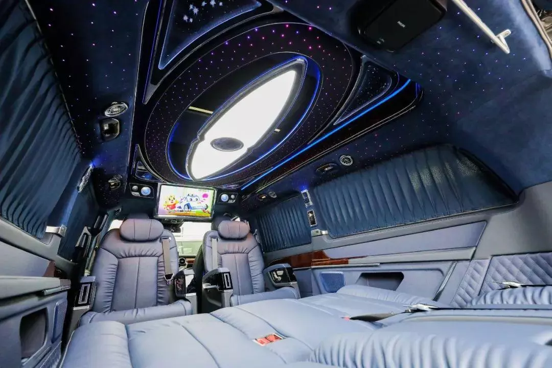 中排标配迈巴赫62s同款的航空头等舱座椅,通风加热按摩一应俱全。整车七座布局设计,不论是家庭用车还是商务接待都很适合,并且中排座椅还支持360°旋转,轻松实现四人对坐模式,前方配备高清曲面大屏,自带环绕影音系统,给您带来影院级别的视听体验。