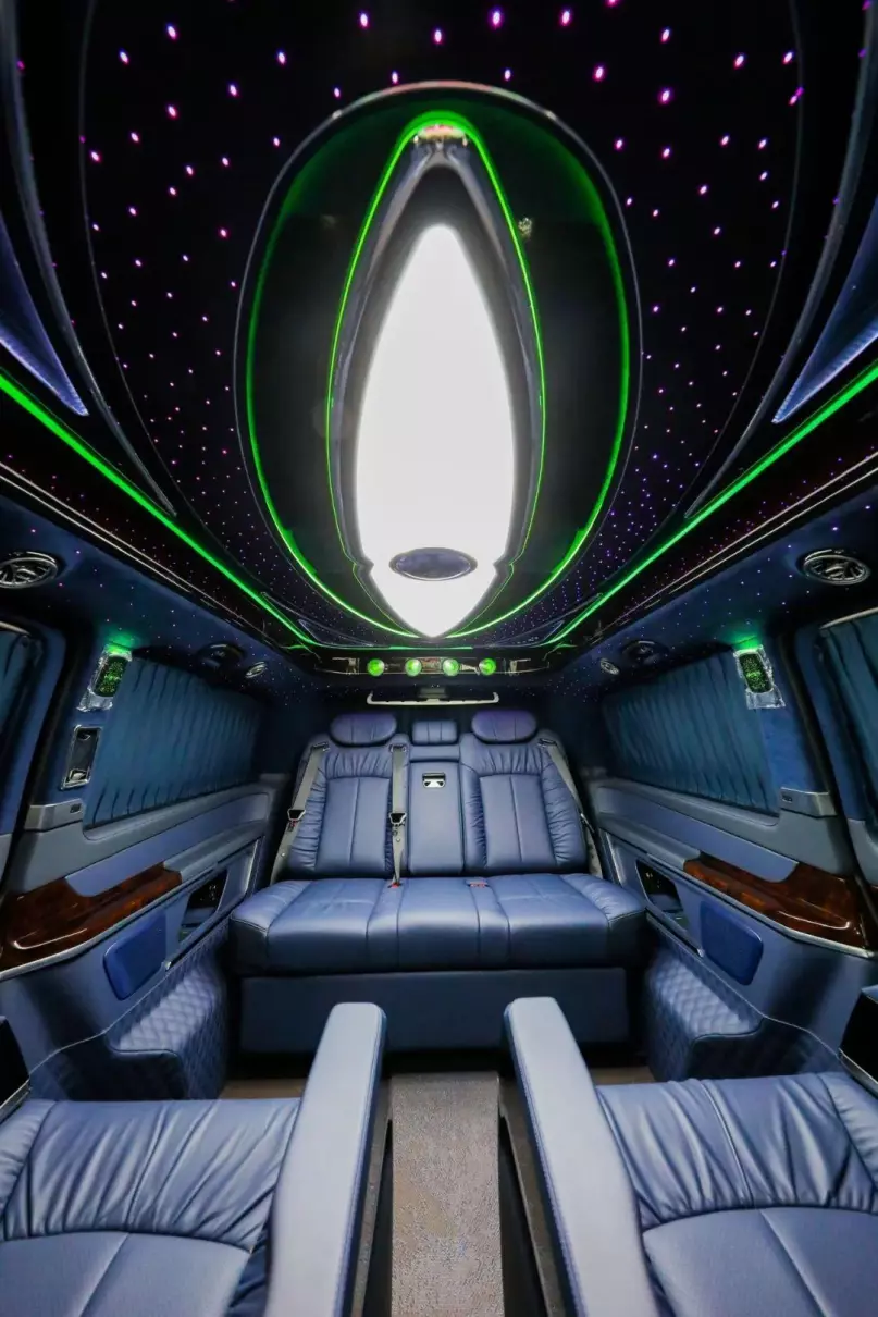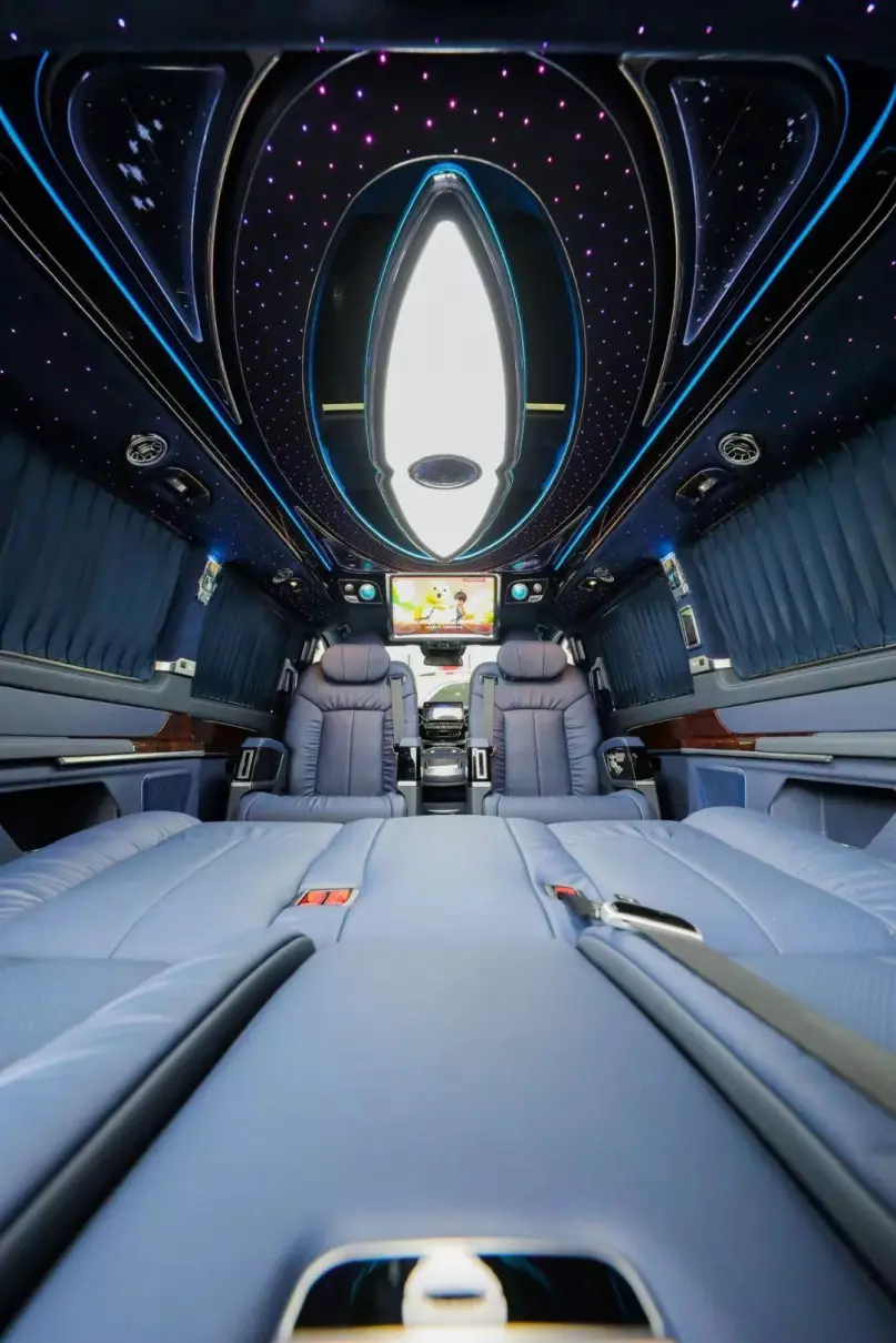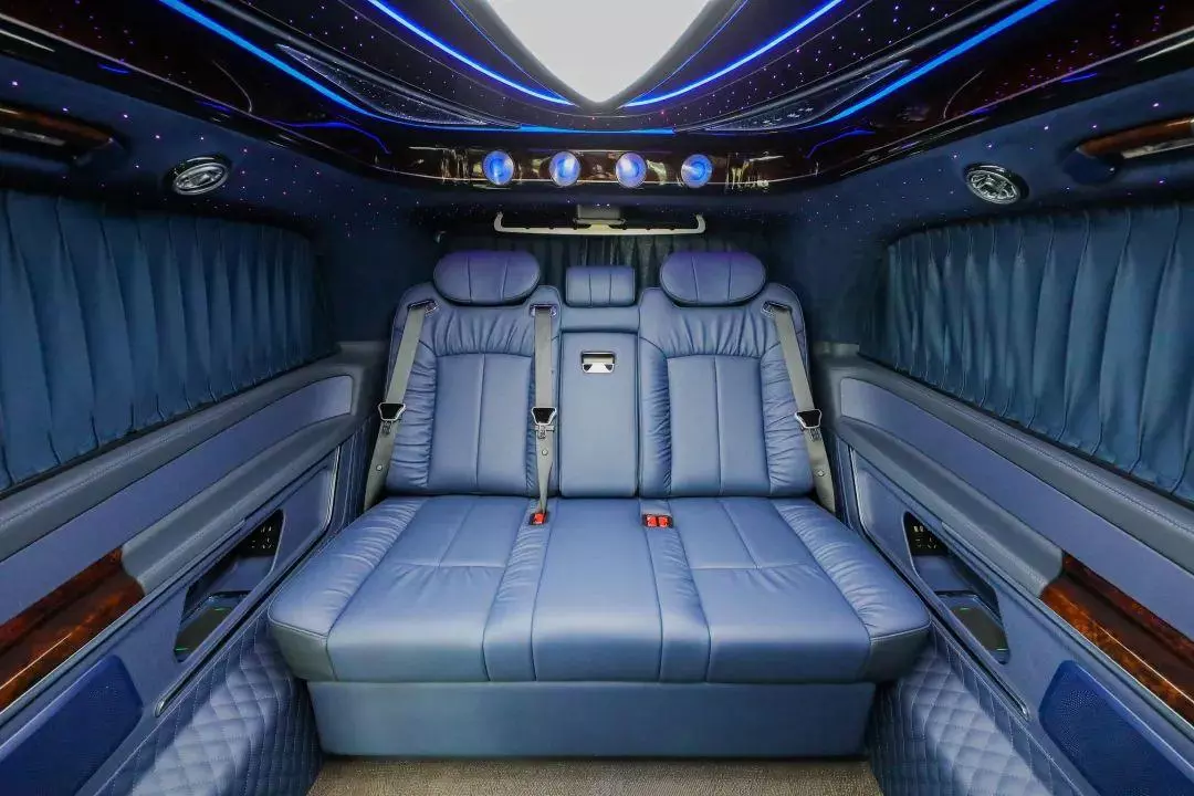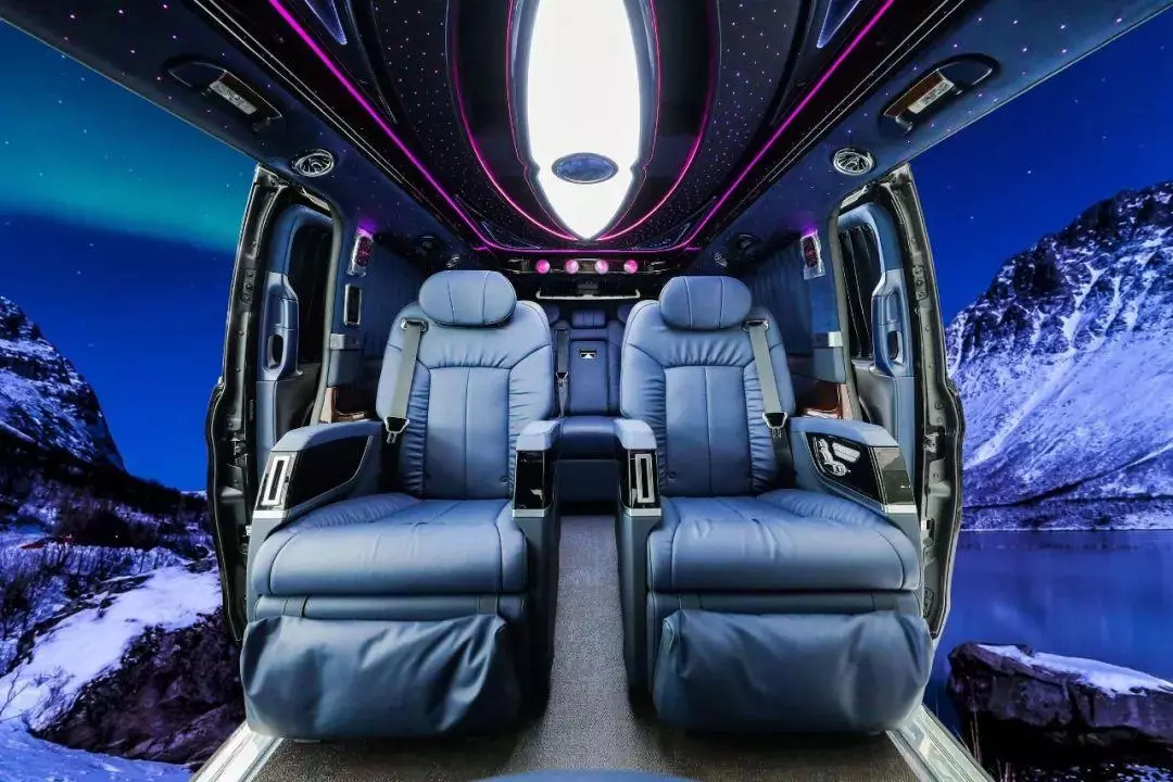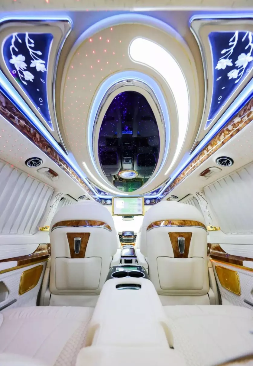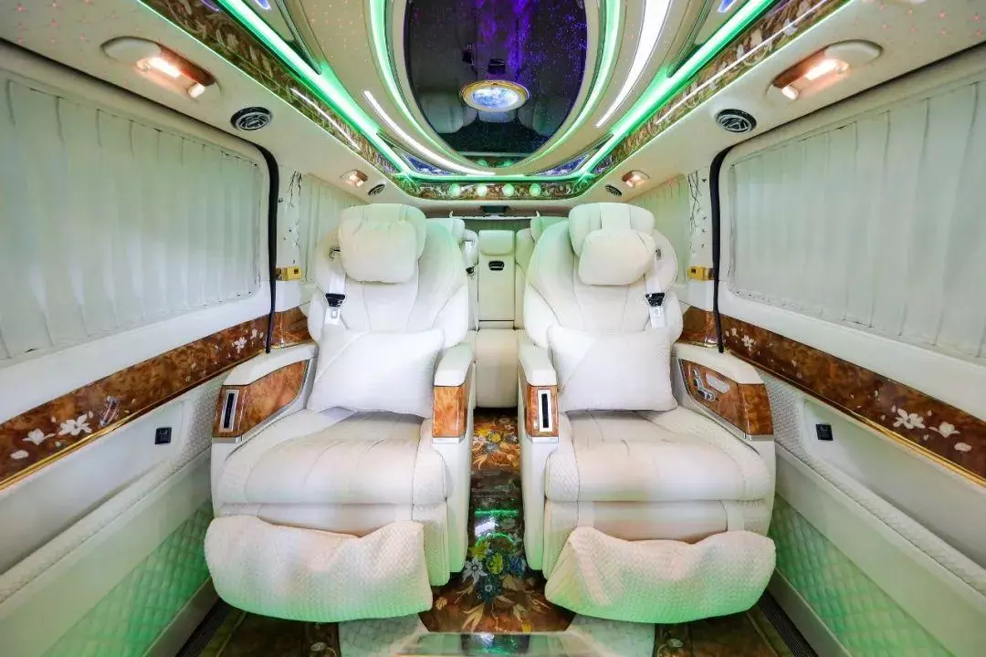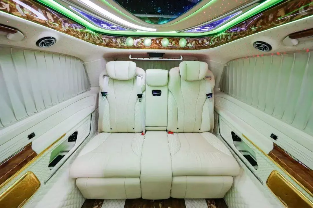 中排标配迈巴赫62s同款的航空头等舱座椅,通风加热按摩一应俱全。整车七座布局设计,不论是家庭用车还是商务接待都很适合,并且中排座椅还支持360°旋转,轻松实现四人对坐模式,前方配备高清曲面大屏,自带环绕影音系统,给您带来影院级别的视听体验。