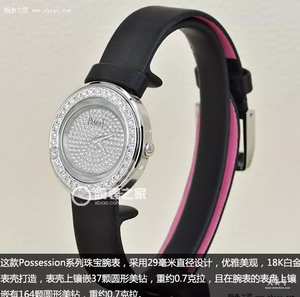 这款possession系列珠宝腕表,采用29毫米直径设计,优雅美观,18k白金表壳打造,表壳上镶嵌37颗圆形美钻,重约0.7克拉,且在腕表的表盘上镶嵌有164颗圆形美钻,重约0.7克拉。