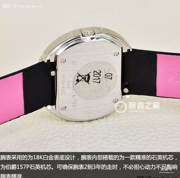 腕表采用的为18k白金表底设计,腕表内部搭载的为一款精准的石英机芯,为伯爵157p石英机芯。可确保腕表2到3年的走时,不必担心动力不足影响腕表精准。