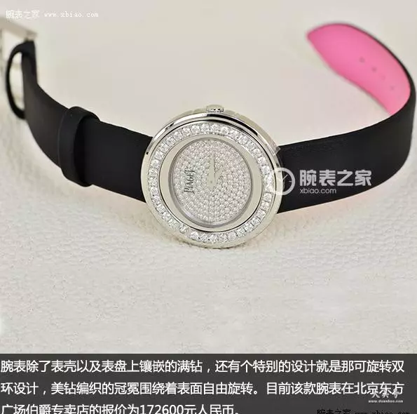 总结:腕表除了表壳以及表盘上镶嵌的满钻,还有个特别的设计就是那可旋转双环设计,美钻编织的冠冕围绕着表面自由旋转。目前该款腕表在北京东方广场伯爵专卖店的报价为172600元人民币。