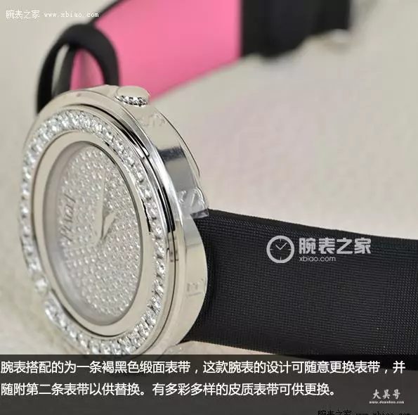 腕表搭配的为一条褐黑色缎面表带,这款腕表的设计可随意更换表带,并随附第二条表带以供替换。有多彩多样的皮质表带可供更换。