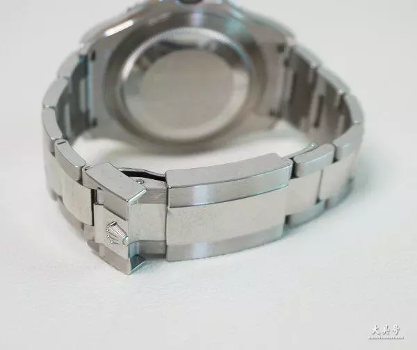 劳力士游艇的表链,钢表还是蚝式表链,金壳游艇是胶带。铂金圈126622是纯钢链,玫瑰金圈的126621是玫瑰金间金表链。游艇的表扣和迪通拿、gmt等一样,折叠扣加一个小盖帽,表链最后一节可以折叠进行缩短/延长半节长度。表扣没有水鬼那样,滑动调节长度的功能。