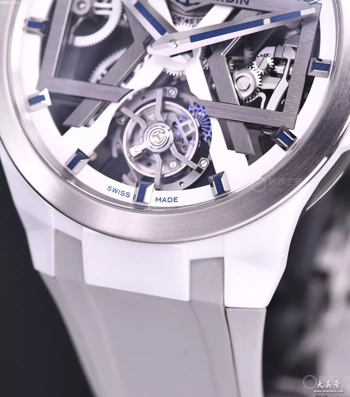 雅典在2016年提出了“x”炫酷风格,blast镂空陀飞轮使用了目前构造最复杂的“x”镂空盘面。由表盘中央长方形框架,向四周发散出巨大的“x”造型,并与表盘外圈相连。中央x造型是双层构造,抛光的白色x与拉丝哑光的灰色x再次形成明暗效果。
